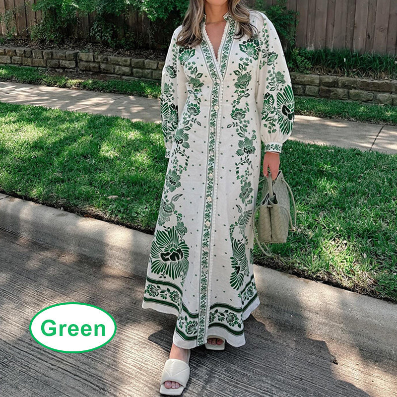 🔥2025 NEW SALES - 50% OFF🔥Printed Long Skirt Lantern Sleeve V-Neck Dress Casual Lace Beach Vacation Long Skirt