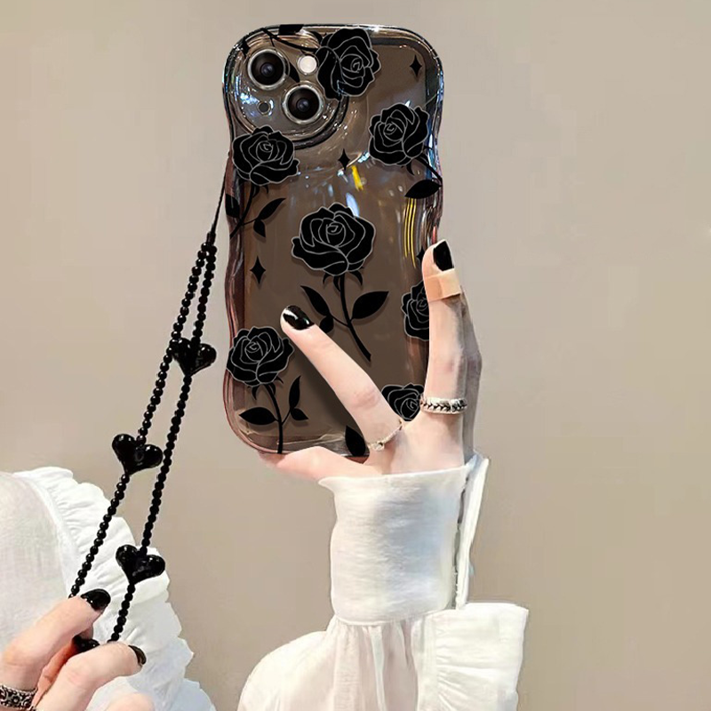 Black Rose Shockproof Wavy Case for iPhone 13–16 Series