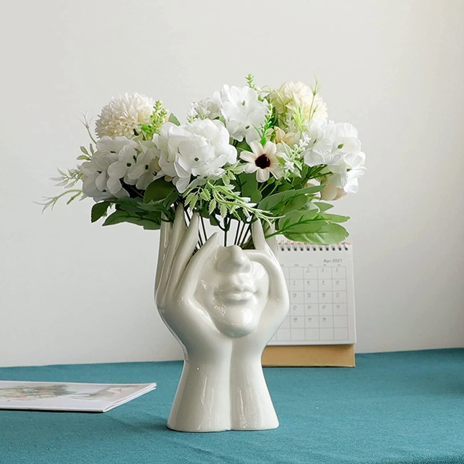 ARTISTIC AND MODERN DESIGN: Features a unique face-shaped white stand with upward-stretching hands, adding artistic charm and personality to any desktop, vanity, or workspace.