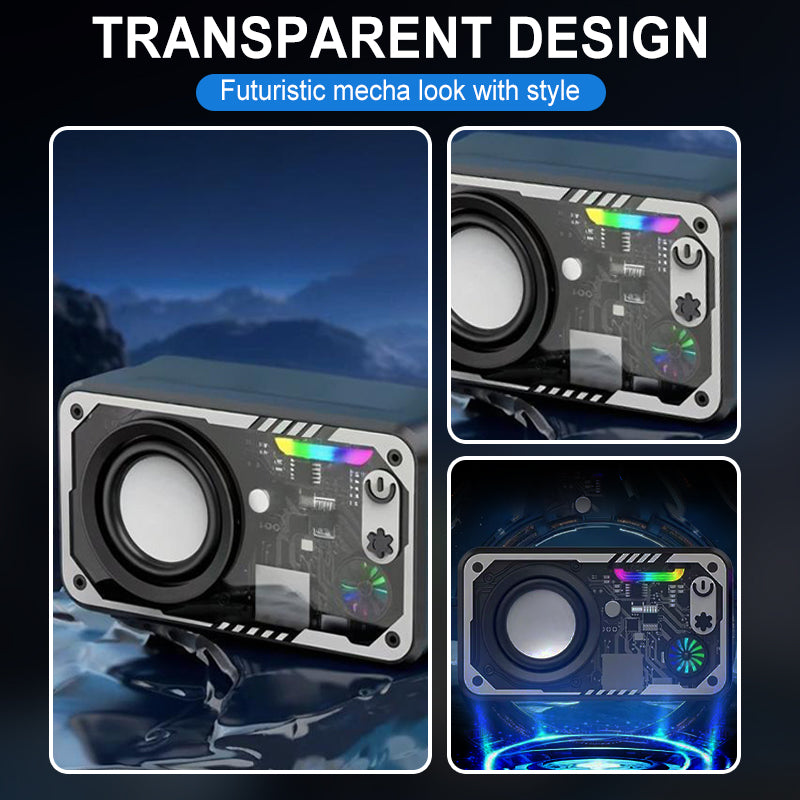 TRANSPARENT MECHA DESIGN – The transparent body with a futuristic mecha-inspired look makes the speaker a centerpiece, not just a device. Its striking design enhances modern living spaces or parties, allowing users to enjoy both aesthetic appeal and practical functionality.