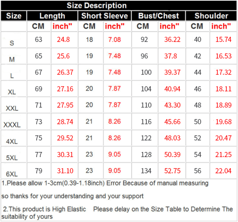 This size chart is for reference only. Sizes may vary between different products. It is a form-fitting t-shirt that is smaller in size than a regular t-shirt. We recommend ordering one or two sizes larger for the best results.