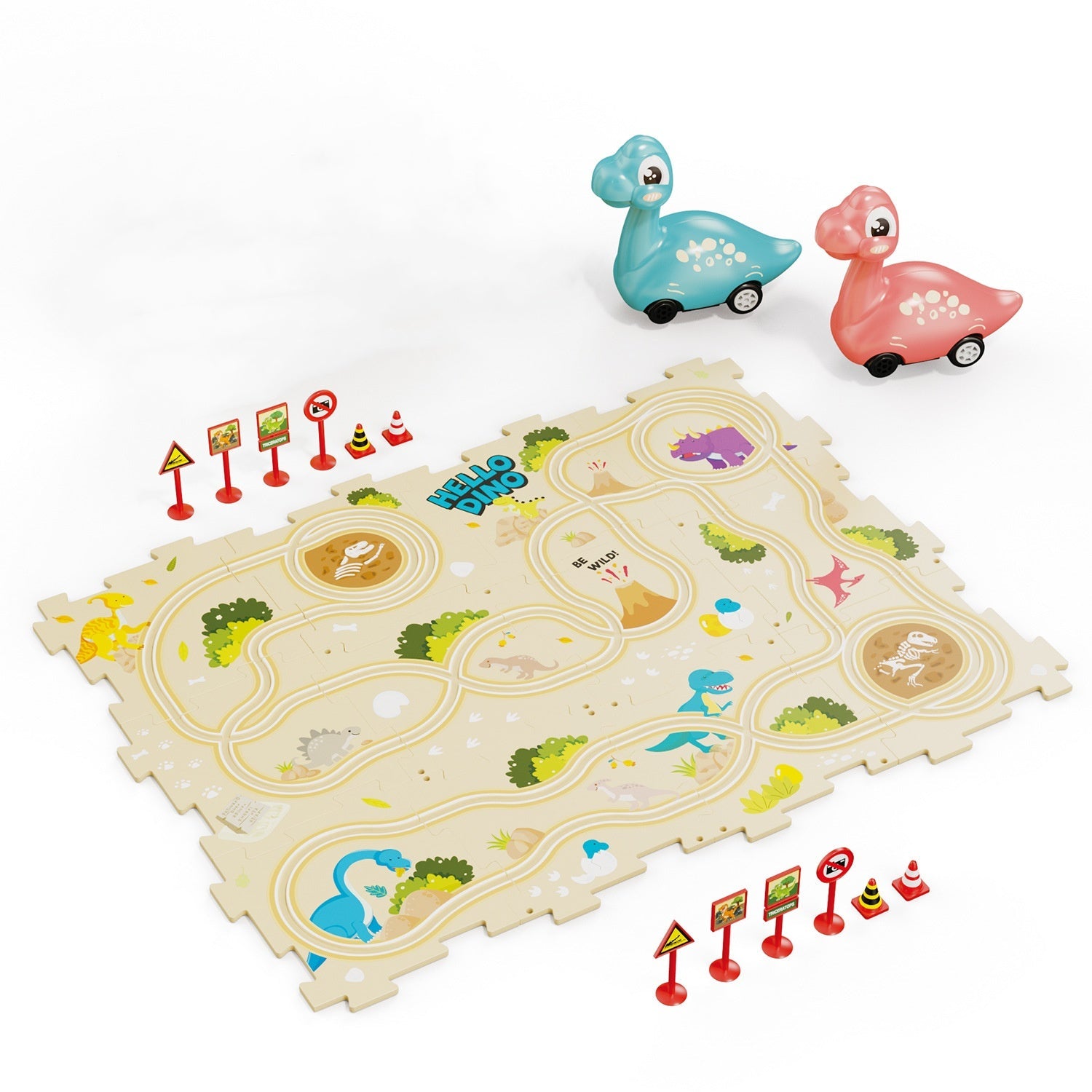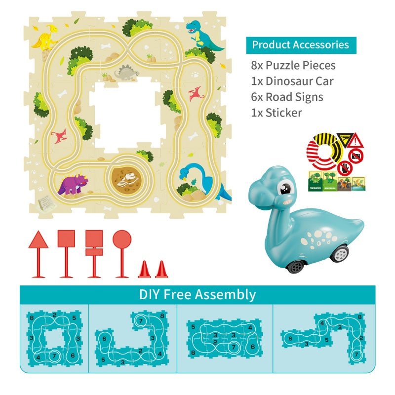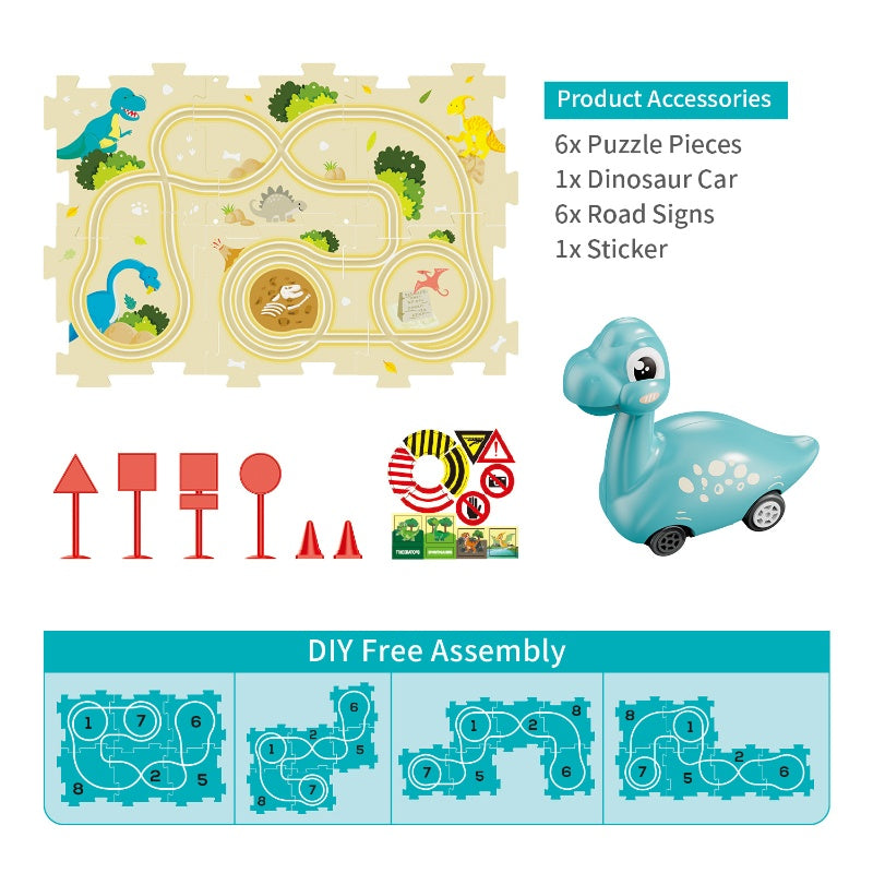 HIGHLY ENTERTAINING:The fun dinosaur shaped car of this toy can run on different puzzle pieces, and its loop track design provides a variety of driving routes. It can improve children's hands-on ability and thinking ability, and it is also an early education tool.