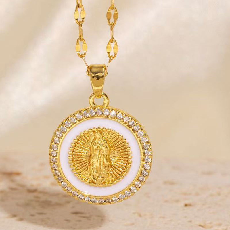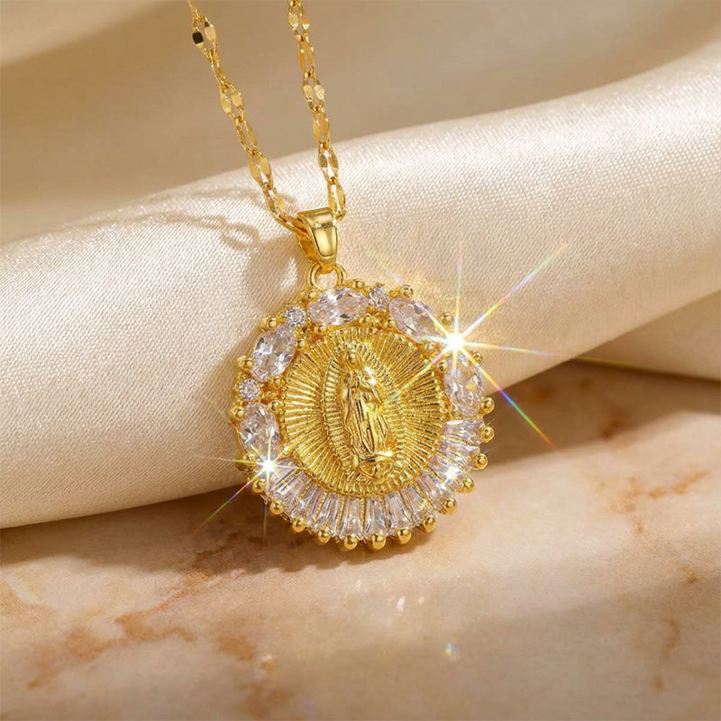 SPARKLING ZIRCONIA HALO - A radiant circle of high-quality zirconia stones frames the central icon, catching the light beautifully to add a touch of divine sparkle and refined elegance to your look.