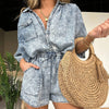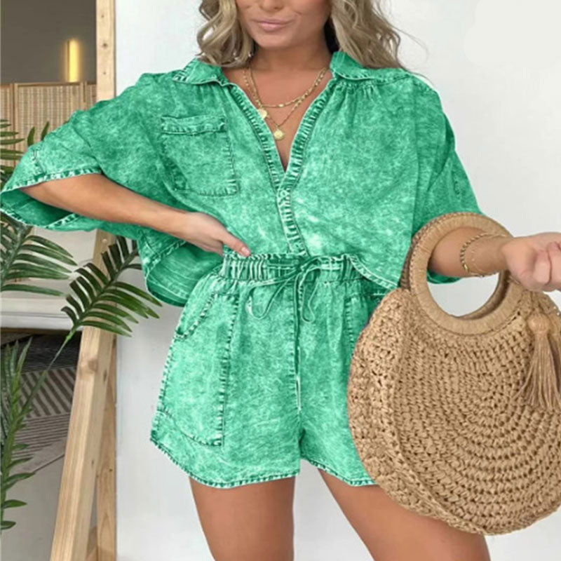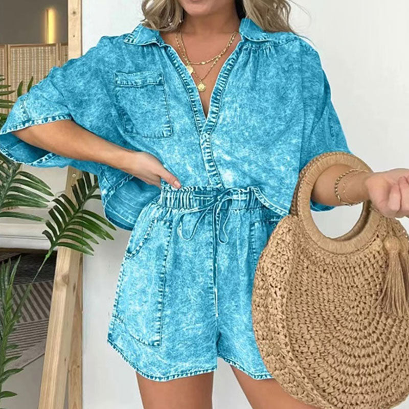 COORDINATED TWO-PIECE SET - This ensemble includes a matching pair of denim shorts, completing the effortlessly chic look. The shorts feature a comfortable elastic waistband and a flattering fit, making them perfect for all-day wear.